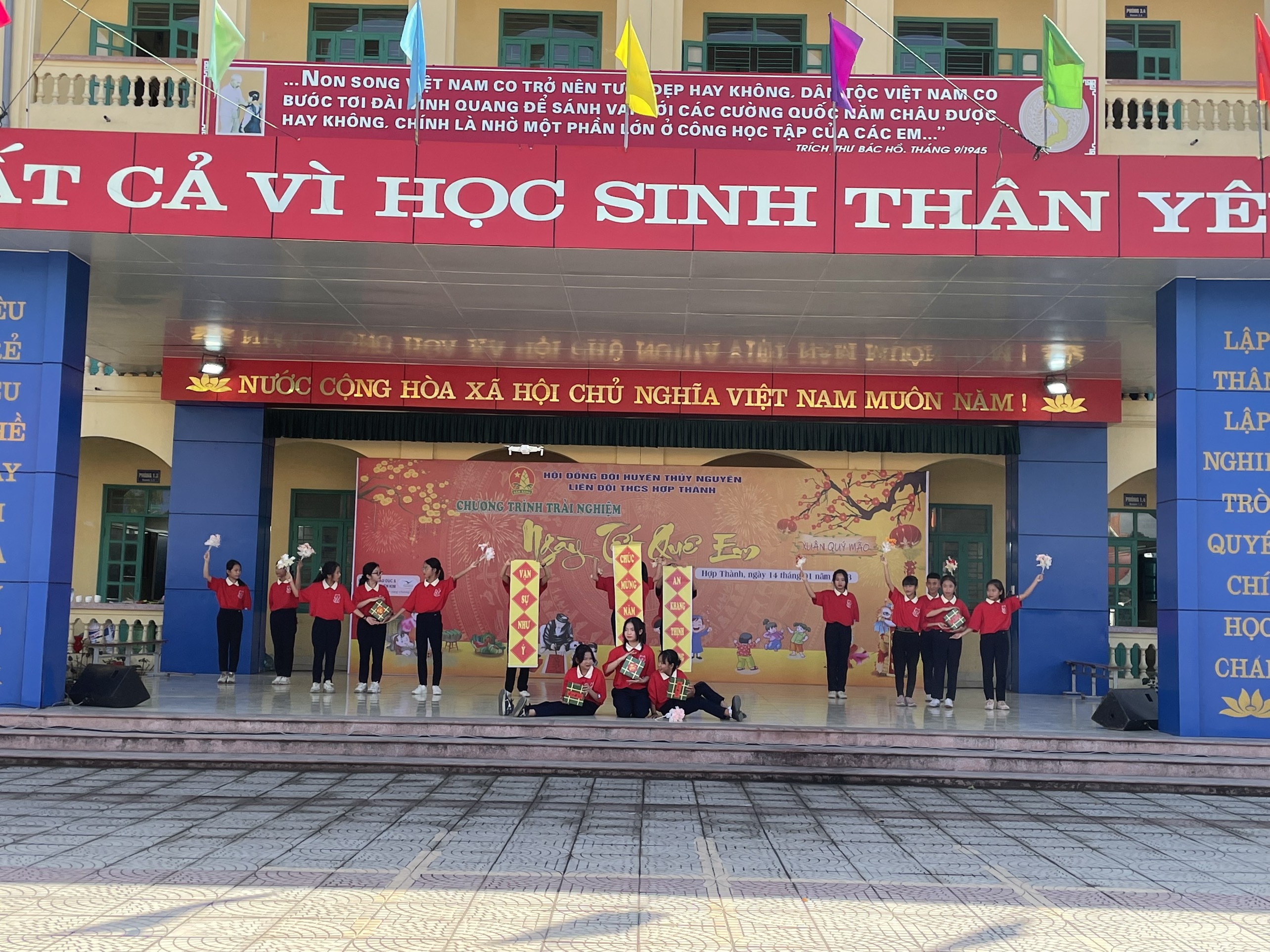 Thực hiện Kế hoạch công tác tháng 1 năm 2023 của nhà trường, được sự cho phép, nhất trí của Phòng GD & ĐT huyện Thuỷ Nguyên, được sự đồng ý của lãnh đạo địa phương xã Hợp Thành và sự ủng hộ nhiệt tình của các bậc cha mẹ học sinh. Ngày 14/01/2023 (tức ngày 23 tháng Chạp năm Quý Mão) Liên đội trường THCS Hợp Thành vui mừng tổ chức hoạt động trải nghiệm ngoại khóa với chủ đề: “Ngày Tết quê em”.