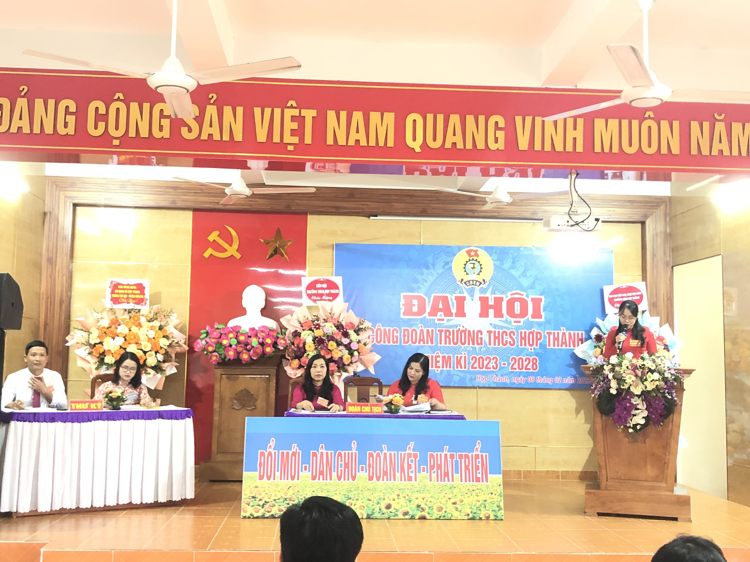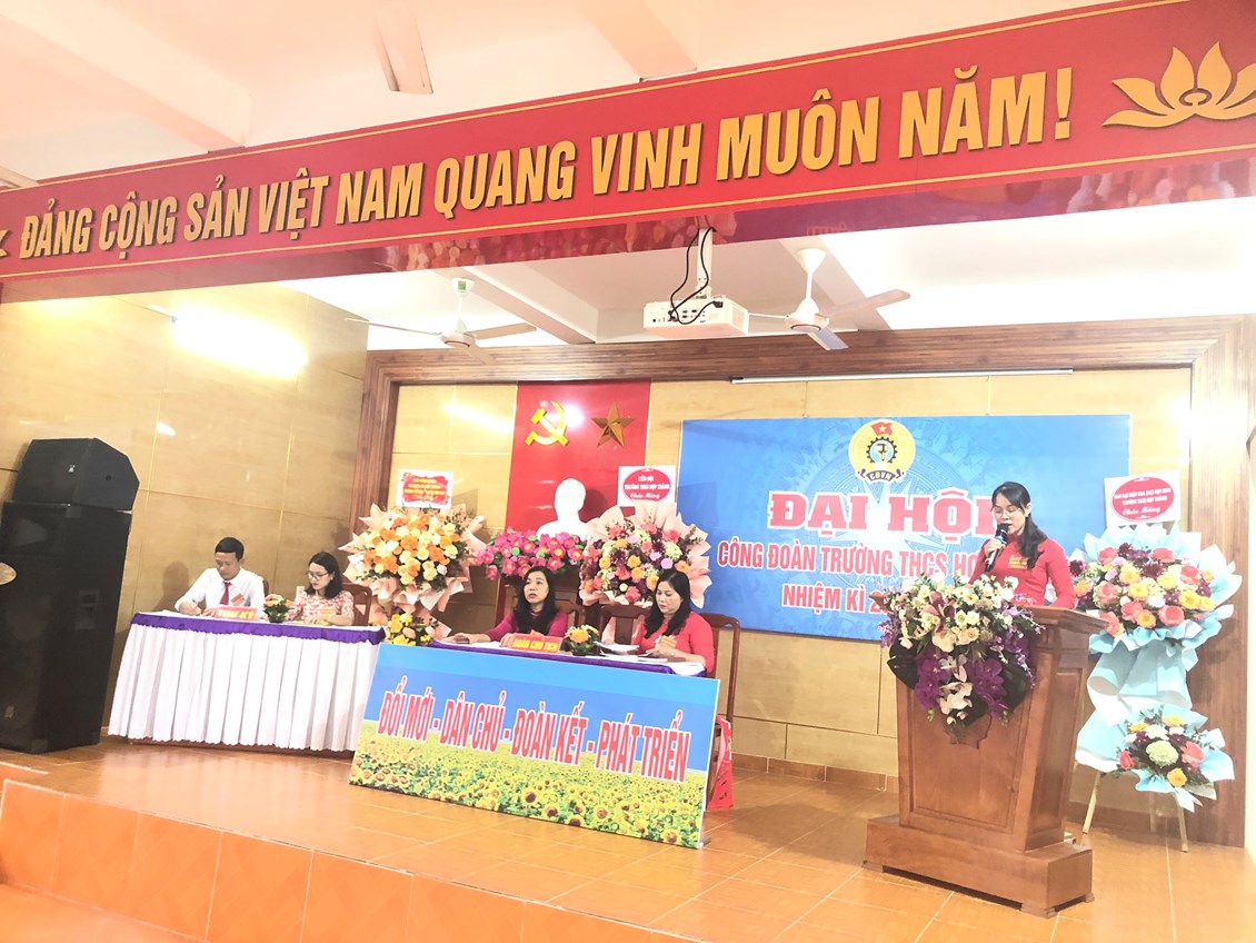 Đại hội đã được lắng nghe Báo cáo tổng kết công tác Công đoàn nhiệm kì 2017-2022 và chỉ tiêu, phương hướng, nhiệm vụ nhiệm kì 2023-202 do đ/c Bùi Thị Kim Loan - Chủ tịch Công đoàn Trường THCS Hợp Thành trình bày.