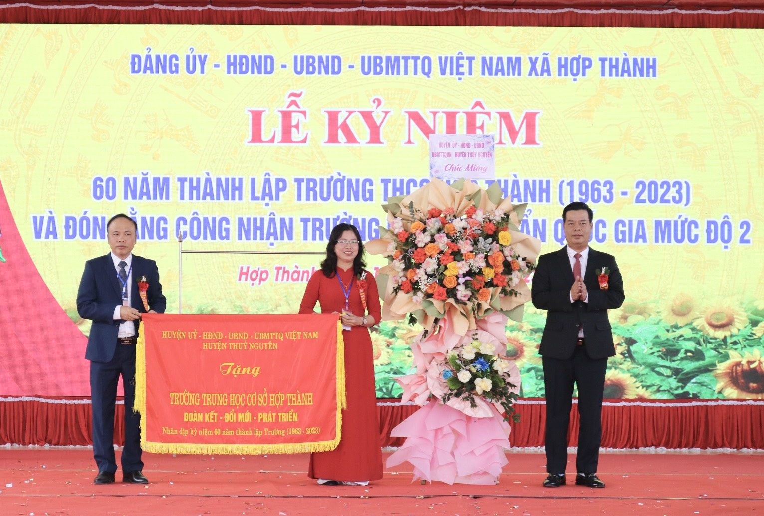 Đồng chí Phạm Văn Thép, Ủy viên Thành ủy, Bí thư Huyện ủy trao bức trướng và tặng hoa chúc mừng tặng trường THCS Hợp Thành.