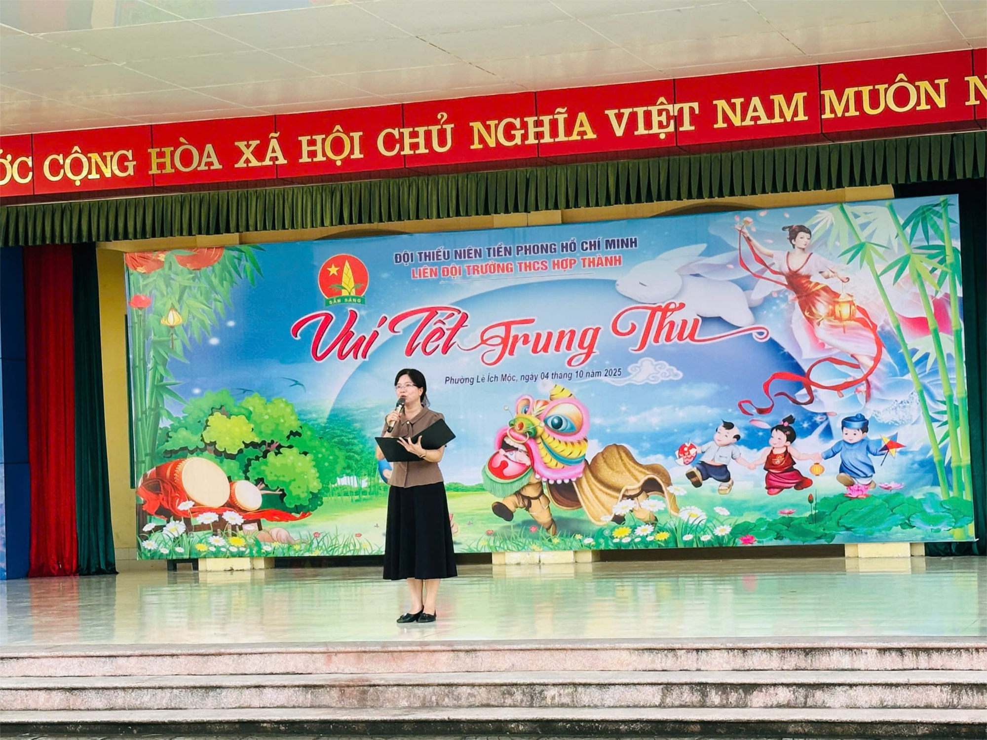 Thực hiện chỉ đạo của UBND phường Lê Ích Mộc; Thực hiện kế hoạch tổ chức các hoạt động giáo dục của nhà trường; Thực hiện chương trình công tác Đội và phong trào thiếu nhi năm học 2025_2026; Được sự nhất trí của BGH nhà trường, sự phối hợp của Hội cha mẹ học sinh, chiều nay _4/10/2025_Liên Đội đã tổ chức thành công chuyên đề VUI TẾT TRUNG THU.