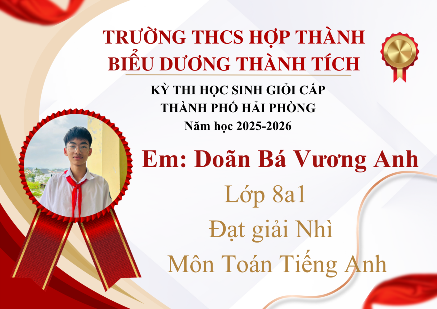 Trường THCS Hợp Thành xin chúc mừng các em học sinh đã xuất sắc đạt thành tích cao trong kỳ thi Học sinh giỏi cấp Thành phố năm học 2025 – 2026:
