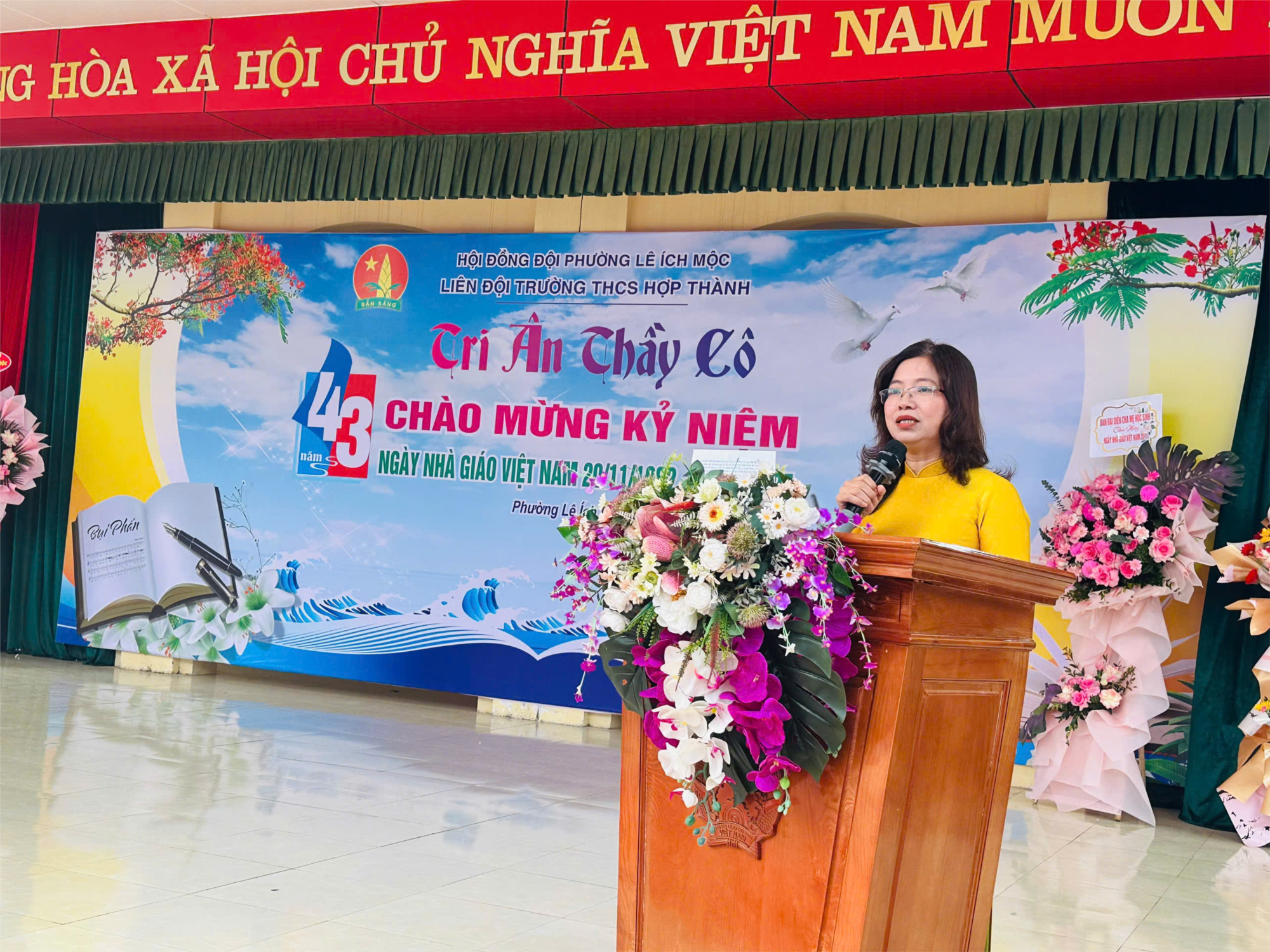 Trong không khí trang trọng, cô Nguyễn Thị Vẻ – Hiệu trưởng nhà trường phát biểu, ôn lại truyền thống tôn sư trọng đạo và gửi lời tri ân sâu sắc tới các thế hệ thầy giáo, cô giáo đã và đang đồng hành cùng nhà trường.